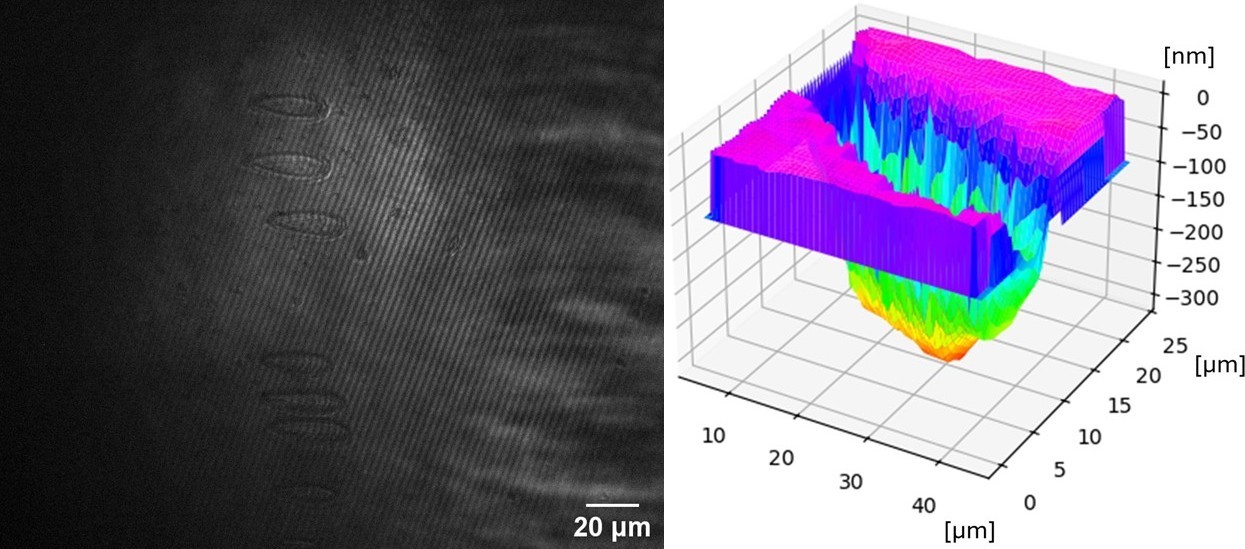 富田研究室では、Linnik干渉計と高調波プローブ光を用いた時間分解干渉観測によって、加工直後の表面形状の変化をナノメートルスケールで可視化し、得られた干渉縞画像を画像解析ソフトとPythonを用いて解析することで表面の凹凸情報から三次元的な形状を再構築する手法を開発・検証しています。この技術により、アブレーション過程における表面構造のダイナミクスを高精度に捉えることが可能となり、フェムト秒レーザー加工技術の基盤理解と応用展開に貢献します。