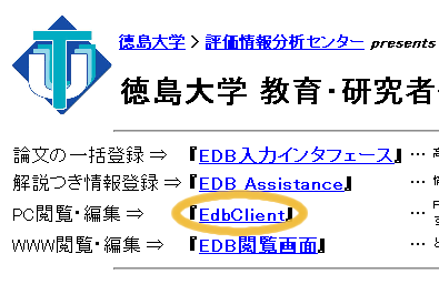EDB のトップページ,EDB における個人や組織等の情報のページ(例: 徳島大学)等の Web ページに表示されている [→EdbClient] のボタンをクリックすることにより EdbClient を起動することができます.